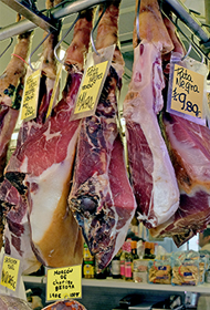 Jamonero...the ham man. Ham is always carved to order if you want the best and the 'Jamonero' is specially trained to cut these expensive hams the right way. Restaurants always have Jamon Iberico on the menu but a less expensive way is to buy 100 grams, about 3 ounces, at a market like this, usually 8-10 Euros. Just remember this ham is at its best when freshly carved, so start eating!