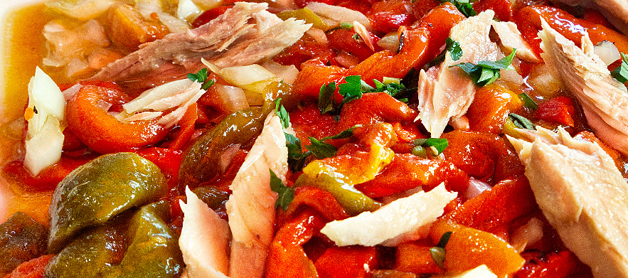 Roasted sweet pepper, grilled artichoke and Iberian ham tapa.