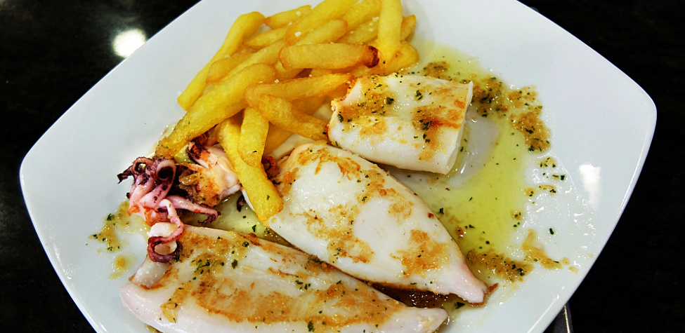 Chipirones a la plancha, a favorite throughout Spain. Tender baby squid in olive oil and garlc. Cerveceria Camas.