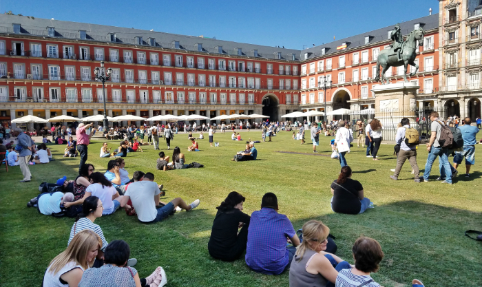 the Plaza Mayor was transformed into a tempory grassy park in 2017.
