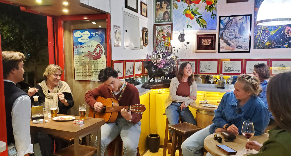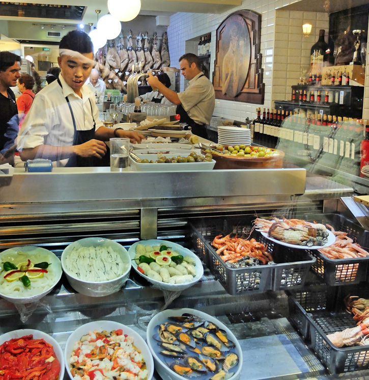 Madrid is bursting with tapas bars, old-fashioned cafés and smart international restaurants so you'll never go hungry. Tapas are a way of life, all day long and into the night. And there are often surprises, at La Fabrica tapa bar a customer brings his guitar and entertains the diners. |